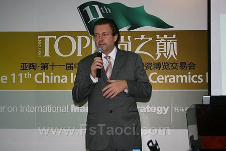 4月19日上午,佛山國(guó)際陶瓷博覽交易會(huì)的第二日,中國(guó)陶瓷城大會(huì)議室座無(wú)虛席,佛亞展覽公司總裁托馬斯先生正在這里進(jìn)行一場(chǎng)以陶瓷產(chǎn)品國(guó)際營(yíng)銷(xiāo)為主題的講座。