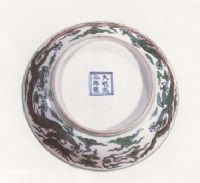 說(shuō) 明: 此盤外壁釉下用青花勾勒雙龍戲珠紋,并在釉上輪廓線內(nèi)填以綠彩,色調(diào)淡雅清新.是成化彩瓷中難得之品.