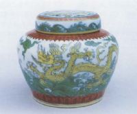 說 明: 底有楷書"天"字款,故又稱"天字罐.造型端莊,施彩亦有獨到之處,龍身施黃彩,云朵、海水填綠彩,浪花不加彩飾,使白浪滔天的氣勢更顯突出.