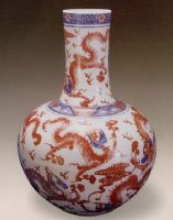 說(shuō) 明: 此瓶用紅料和國(guó)產(chǎn)青料做著色劑,在胎上彩繪,然后施透明釉,在高溫下一次燒成.色調(diào)鮮艷,是景德鎮(zhèn)官窯名瓷之一.