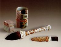 說 明: 以書和古琴的樣式來做文房用具,擱置案頭,顯得靈巧雅致,既可觀賞,又能把玩,構(gòu)思奇特.乾隆開始流行用陶瓷材料去模仿其他各種質(zhì)地的工藝品,而且達(dá)到了惟妙惟肖的境地.