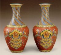 說 明: 此瓶采用軋道工藝的裝飾方法,顯行華貴艷麗,頗有"錦上添花"的藝術(shù)效果,體現(xiàn)了乾隆時期崇尚繁縟奢華的特點,應(yīng)為宮廷舊物.