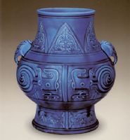 說 明: 此器造型和圖案均模仿古銅器,在孔雀綠釉的襯托下,頗顯古樸凝重.
