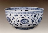 說 明: 此器形制存在元代遺風:純樸渾厚,紋飾描繪嫻熟明快.洪武時期的青花具有元代青花的于濃重色調(diào)中見凝滯黑斑的現(xiàn)象,但普遍泛灰沒有神采.