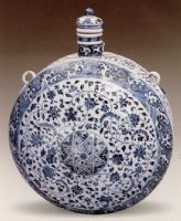 說 明: 此壺又稱臥壺,造型奇特,系受當(dāng)時(shí)西亞文化影響的結(jié)果,青花呈色濃艷,用進(jìn)口青料繪制而成.