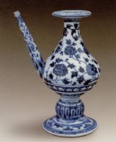 說(shuō) 明: 此器系西亞文化影響的產(chǎn)物,造型雅致.梵語(yǔ)謂之"凈瓶"、"軍持".用"蘇麻離青"料繪纏枝蓮紋,紋飾線條纖細(xì)有力,色彩艷麗.