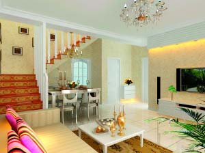 在風格設計上,基本按照業(yè)主要求的田園風格:客廳墻壁以淺黃色壁紙為主,沙發(fā)背景墻則使用花朵壁紙,營造出自然、柔和、甜美的感覺。樓梯采用木質(zhì)階梯,白色扶手與客廳的地面、頂面、家具、門相呼應,突出干凈大方的環(huán)境。樓梯墻壁較長顯得空白,建議可以做成照片墻,將兩人的相片放置于此,上樓梯的時候能看到成長、認識、相戀的過程,感覺溫馨甜蜜。