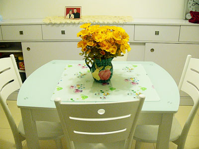 餐前柜也是鞋柜一個廠家訂做的,唯一不滿意的東西。果然我不在家那天挑顏色方面就會出錯,偶當(dāng)時為了配合這個純白風(fēng)格,千叮萬囑要乳白色的,結(jié)果還是做了個啞光白的,而且拉環(huán)也超不搭配的。爸爸只考慮到實用,偶呢要求美觀。湊合著用吧,有時間買桶白漆買些田園把手來改造一下~~~