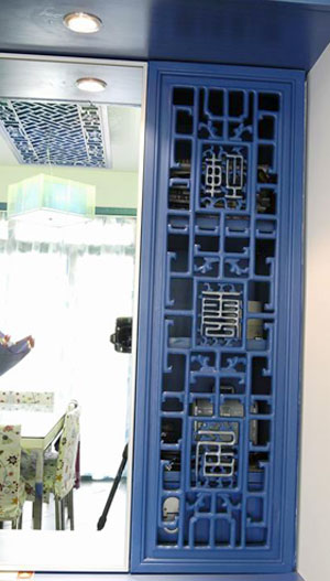 餐廳里的花板吊頂把中式復(fù)古風(fēng)格體現(xiàn)的淋漓盡致。這樣的花板買回來是紅木色的,為突出整體色彩而噴成了藍(lán)色,效果不錯(cuò)哦,配上一盞簡潔現(xiàn)代感十足的吊燈,中式風(fēng)格這種表現(xiàn)使整個(gè)空間,傳統(tǒng)中透著現(xiàn)代,現(xiàn)代中揉著古典。