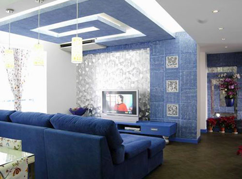 客廳體現(xiàn)了現(xiàn)代中式的復古情懷。整體以藍色與白色為主打色,這使空間感覺既清爽又有多了份淳樸感。電視背景墻設計采用銀色的墻紙,這不僅使客廳空間顯得很明亮而且還很漂亮,突出了客廳的個性與時尚感?蛷d里采用回紋式的吊頂,這是很少見的現(xiàn)代中式風格的一種設計表現(xiàn)法(據(jù)說采用回紋設計是女業(yè)主在逛街的時候偶爾看見的覺得這種圖案很特別,接著在后來很多地方都設計回紋),這既是現(xiàn)代中式風格標志又與眾不同很有感覺?蛷d采用了深色的地磚這與客廳淡雅的色彩形成鮮明的對比,深色的地磚還避免了由于吊頂而產(chǎn)生頭重腳輕的感覺,使空間多了份濃郁的書香氣息。
