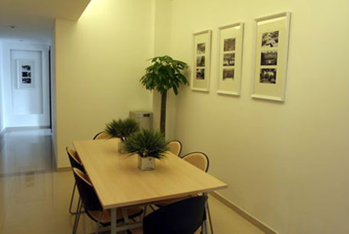 餐廳也是以干凈清爽的白色為主,白色的墻壁上掛了三幅畫(huà),每幅畫(huà)中又三幅小畫(huà)組成,這組畫(huà)掛在白色的墻壁上充滿(mǎn)了老北京的懷舊感。簡(jiǎn)單原木色的六人餐桌顯得很現(xiàn)代,稍加觀察可以發(fā)現(xiàn)餐椅背后的別樣設(shè)計(jì),這符合了老外們對(duì)于生活的休閑設(shè)計(jì)。吊頂上設(shè)計(jì)了帶有色彩的射燈,射燈顏色為淡黃色,黃色既具有東方的柔美又表現(xiàn)了西方的神韻、現(xiàn)代又傳統(tǒng)、感性而又充滿(mǎn)理性。綠色的植物使整個(gè)空間充滿(mǎn)了生氣。