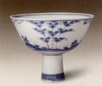 說 明: 成化時期高足碗碗身所占比例大,足柄較短,形成了這一時期高足碗的特點.明成化時期松竹梅紋風格清秀淡雅.