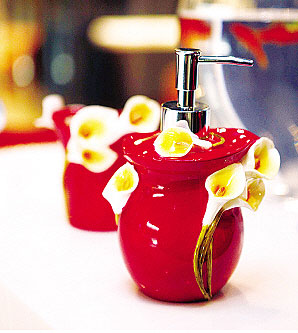 制造陶瓷一向是中國(guó)人的拿手技術(shù),這個(gè)乳液瓶和牙刷架采用了整體燒制的手法,花朵造型逼真,再搭配接近透明的材質(zhì),賦予衛(wèi)浴一種別樣的美感。