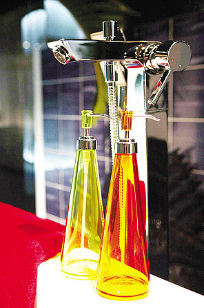 這款高高的瓶子最突出的特點(diǎn)就是大,足以把大瓶的洗發(fā)水全部裝進(jìn)去,讓主婦們不必?fù)?dān)心洗手臺(tái)擺滿瓶瓶罐罐。樹(shù)脂材質(zhì)透明的特性,讓人在使用時(shí)更方便分辨出產(chǎn)品種類。樹(shù)脂材質(zhì)繽紛的色彩也給空間增添了幾抹亮色,讓人在略顯沉悶的空間里也覺(jué)得歡快。