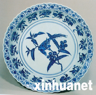 青花花鳥紋盤,口徑50.5厘米,明永樂時期景德鎮(zhèn)窯所燒制。日本重要文化財,是最早進入安宅收藏視野的一件明代青花瓷器。盤口呈菱花形,折沿上繪有二方連續(xù)卷枝番蓮紋,內(nèi)壁散點式布置16組折枝花果紋,有石榴、荔枝、桃實、枇杷等果實,外壁口沿繪海水江牙紋,腹部也是繪16組折枝花卉紋,內(nèi)外互相呼應。盤的內(nèi)底中央則繪有一綬帶鳥棲于枇杷枝上啄食果實,形態(tài)活潑生動,宛如中國畫的折枝花鳥圖。永樂宣德時期的青花瓷器以其胎釉精細、青色濃艷、造型多樣和紋飾優(yōu)美而負盛名,被稱為我國青花瓷器的黃金時代。這一時期的青花料多為波斯進口的所謂"蘇麻離青",且原料加工精致,白釉很純凈。畫瓷藝術也更具有中國水墨畫風格,畫面布局疏朗,文人情趣益加濃厚。