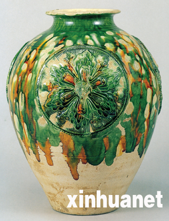 三彩貼花寶相花紋壺,唐代器物,高30.9厘米,被指定為重要美術品。撇口,短頸內(nèi)束,廣肩鼓腹,凹足,形體高大端莊。器身以白釉涂成白色斑點 ,再以綠釉、褐釉間施以其間,頗具蠟染的效果。壺腹貼有三組寶相花與海石榴紋相結合組成的圓形圖案,圖案周以連珠紋相圍。海石榴系從伊朗傳入,進入中國本土后,常與寶相花、蓮花、葡萄等相配,其形象或是在盛開的花朵中心露出綻開的石榴果,或花苞之中滿是石榴籽。海石榴紋最早出現(xiàn)于唐三彩陶器上。此件三彩器上頗似蠟染的釉面及海石榴和連珠紋的裝飾題材都深受西亞文化的影響。