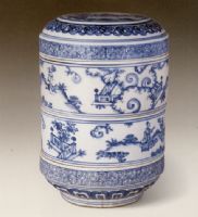說 明: 盒體呈燈籠式,分為三層.全器紋飾構(gòu)圖層次清楚,青花色澤淡雅,釉質(zhì)瑩潤,為正德青花瓷器中的上乘之作.