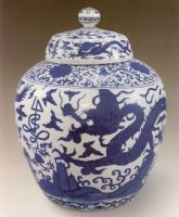 說 明: 此罐胎質(zhì)細(xì)膩.造型渾厚雄偉,構(gòu)圖嚴(yán)謹(jǐn).青花色調(diào)翠藍(lán)濃艷,微泛紫紅色.器口處有"大明嘉靖年制"款.