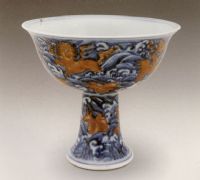 說 明: 此杯在釉下以青花海水作為地色,釉上用礬紅料染繪海獸,構(gòu)圖十分新穎.是宣德青花加彩器中的杰作.