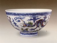 說 明: 此碗把青花與紅綠彩結(jié)合起來,在一條龍身上,既有青花,又輔以紅綠彩,在色彩上比前朝龍紋豐富.碗足內(nèi)青花雙圈"正德年制"四字楷書款,是正德時期具代表性的器物.