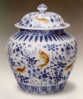 說(shuō) 明: 此罐魚(yú)紋體形較前期的肥大,魚(yú)身施以礬紅彩.彩下以黃色為地,魚(yú)鱗及魚(yú)身輪廓均用褐彩勾勒,這又是礬紅彩的另一作風(fēng).整個(gè)蓋罐繪工精細(xì),釉色光潤(rùn).