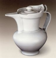 說 明: 僧帽壺闊頸,一側有流,前伸似鴨嘴狀.另一側有寬帶形曲柄.通體及足內均施白釉.