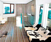 在衛(wèi)浴中安置實(shí)木墻面,看起來(lái)是不實(shí)際的做法。其實(shí),只要處理得當(dāng)未嘗不是一種打破常態(tài)的有效手法。要選用專(zhuān)業(yè)廠家生產(chǎn)的產(chǎn)品,以考究的表面處理工藝來(lái)抵擋溫度、濕度的侵襲,確;拈L(zhǎng)期在衛(wèi)生間內(nèi)使用不會(huì)開(kāi)裂變形。設(shè)計(jì)師建議,選用香柏木、紅椿木、杉木等優(yōu)質(zhì)木材。