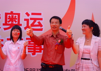 簡總帶著工作小組還為現(xiàn)場市民指導(dǎo)做奧運姿勢”中國加油 奧運加油”