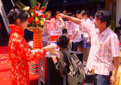 到今天活動的高潮, 金朝陽品牌總經(jīng)理簡總和福州元成建材有限公司總經(jīng)理王祥平為奧運之星基金會公益捐款開啟儀式揭開帷幕