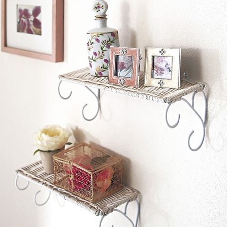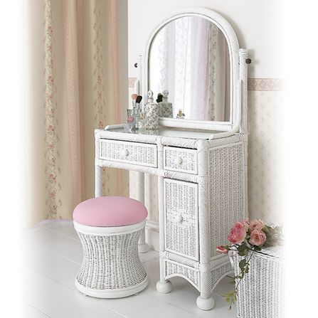 藤制梳妝臺+藤制坐凳,粉色的坐墊以及收納框上的插花是點睛之筆。