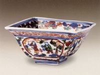 說 明: 方斗杯是明代嘉靖時期特有的器型之一.此杯整體構(gòu)圖較為飽滿,青花與紅彩為主要色彩.這兩種色彩反差較大,鮮麗明亮,為嘉靖時期獨特的用彩方法.