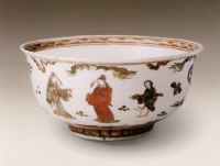 說 明: 此碗造型古樸敦厚,釉質(zhì)瑩潤,人物神采飄逸,為嘉靖民窯五彩器佳作.特別是內(nèi)壁有暗花裝飾,在嘉靖五彩瓷中殊為少見.
