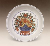 說 明: 此盤色彩斑斕,花葉旁點綴蜜蜂,繞花而飛,更添情趣.為萬歷五彩之佳品.