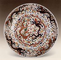 說 明: 此盤構(gòu)圖飽滿,畫面突出紅彩,艷麗奪目,為萬歷五彩瓷器中之精品.