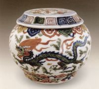 說 明: 此罐形制規(guī)整,紋飾流利,色彩鮮艷,是萬歷時期景德鎮(zhèn)五彩瓷器中的典型作品.