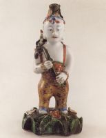 說 明: 此為持荷童子像,以白釉為肌膚,青花為頭發(fā),服飾色彩鮮艷.