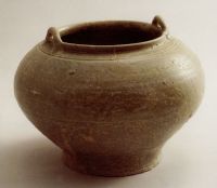 說(shuō) 明: 直口上附一對(duì)半環(huán)形立耳,球形腹,平底似假圈足.腹部劃細(xì)弦紋.施青釉.