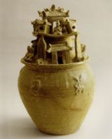 說 明: 倉上部系一上下兩層的建筑模型,下部呈罐形,腹壁附貼六個翩翩起舞的人像.