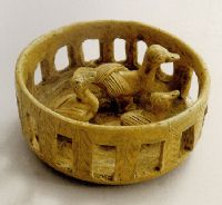 說 明: 施青釉,略呈黃綠色,底部露胎,整器集雕塑、鏤空、印紋于一身,工藝精巧,造型形象生動.