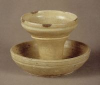 說 明: 燈由盞、柱、盤三部份組成.淡青釉,釉不及底,胎色灰白.此器型制獨(dú)特,系東晉青瓷典型器.