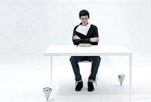 一張桌子四條腿,這基本可以說是個常識,造型古怪的桌子當(dāng)然可以除外,但是上面圖中這個造型很中規(guī)中矩的長方形桌子,卻只有兩條腿。 兩條腿的桌子一定站不穩(wěn),這基本也是個常識。但是這張桌子殘缺的兩條腿的地方用很細(xì)的繩子吊上了兩個很重的鉛錘。你覺得,這桌子能站穩(wěn)嗎?