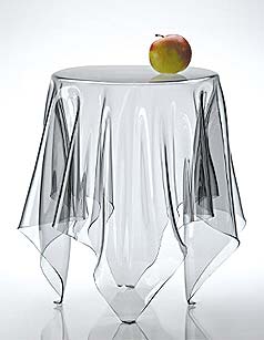 硬質(zhì)腈綸材質(zhì),手工打造,顛覆人們對桌子和桌布的慣常理解。我們見慣了四條腿的桌子和桌子上垂下的柔軟的桌布,這次看起來貌似柔軟的透明桌布居然四只腳立在地上,是不是很新奇呢?