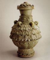 說 明: 北朝.此器通體施青釉,色黃綠.集中運用印貼、刻劃和堆塑等藝術(shù)手法,融粗凸細(xì)凹于一體,氣韻華貴典雅.