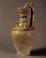 說 明: 胎質(zhì)疏松,胎骨較輕,胎色灰白.造型修長.釉色青中閃黃.為隋代雞首壺之典型.