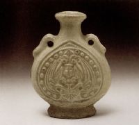說 明: 此器施白色釉不到底,有較粗的冰裂紋.造型新穎別致,紋飾可能受佛教及外來文化的影響.