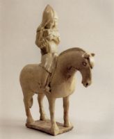 說 明: 陶胎白色,通體著單色黃釉,上有冰裂紋.人物造型尚具南北朝遺風(fēng).