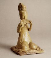 說 明: 此俑是黃釉樂舞俑群中的一員.俑白胎,通體施黃釉,并施彩繪,年久已脫落.