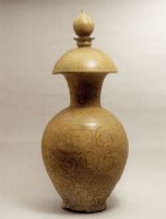 說 明: 釉色青黃,釉面潤澤晶瑩,通體繪釉上褐彩如意云紋.器型莊重雄偉,極其氣魄.為越窯精品,也是當(dāng)時貢品.