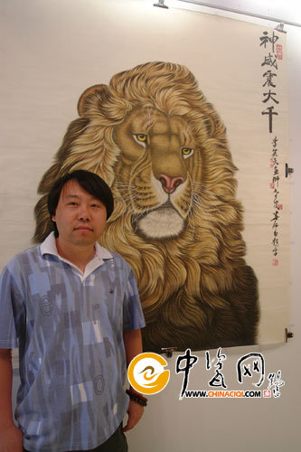 此次在珠山陶瓷藝術(shù)館舉辦的展覽,是李笑天第一次在景德鎮(zhèn)舉辦的個(gè)人作品展,展覽作品包括國(guó)畫、絹畫、陶瓷。其中長(zhǎng)絹《百虎圖》尤其吸引人,一百只老虎形態(tài)各異,或嬉戲,或靜臥,調(diào)皮可愛(ài)的形象躍然紙上。工筆《神威震大千》中獅子形象逼真,鼻子上的短毛歷歷可數(shù),表現(xiàn)了作者深厚的功底。