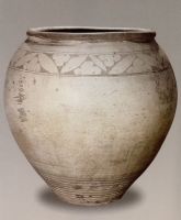 說 明: 缸胎粗砂體,胎質硬度略差,施釉牙白,光澤柔潤。